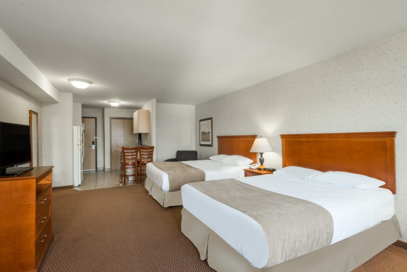 Guests enjoy thoughtful amenities including free WiFi, a fitness centre, and a heated indoor pool with a waterslide—perfect for families and road-weary travellers alike. On-site guest laundry facilities and ample parking for buses, trucks, and RVs make extended stays and group travel seamless. Each guest room features a mini-fridge, microwave, and complimentary internet, while suites offer added comfort with hot tubs or full-efficiency layouts ideal for longer visits.